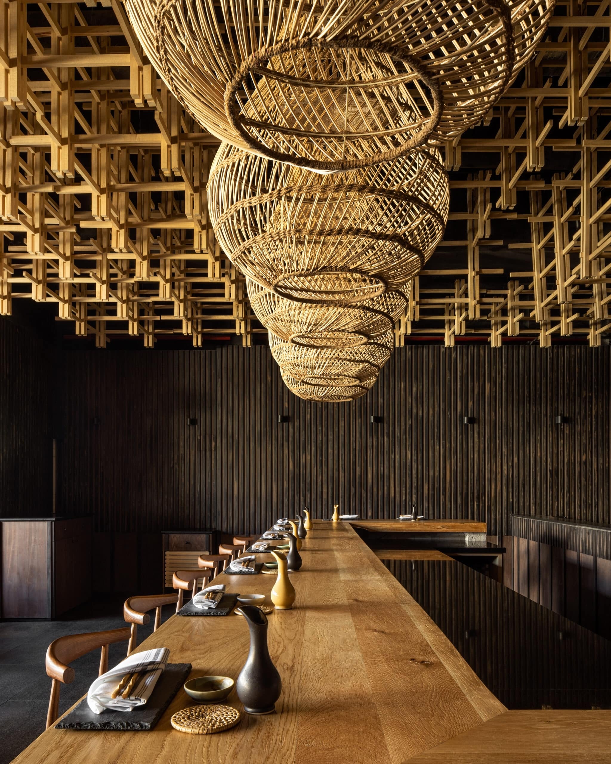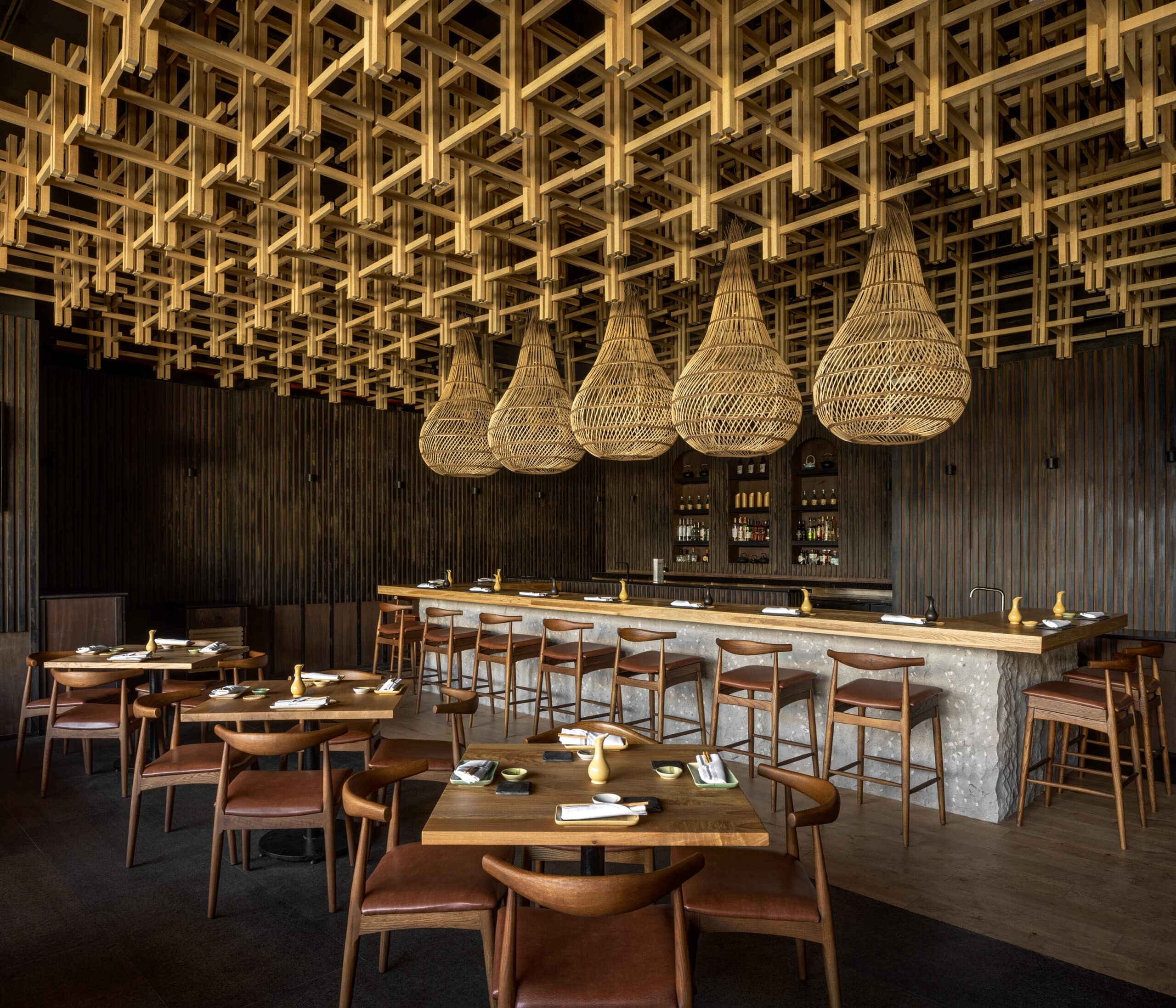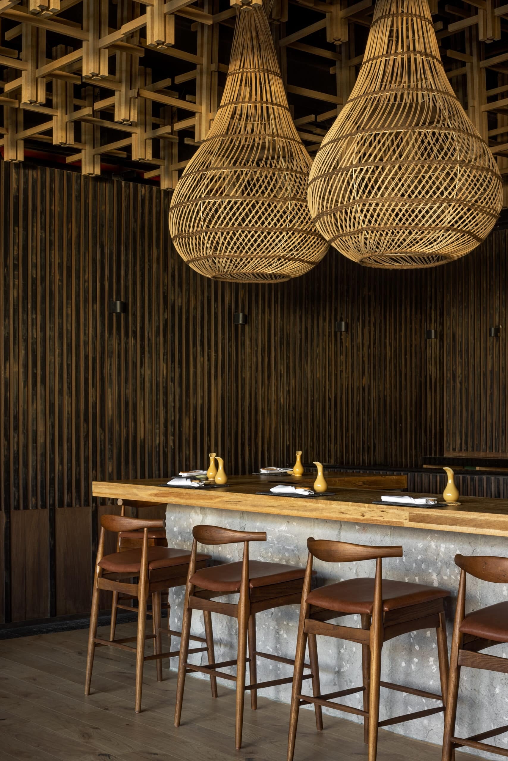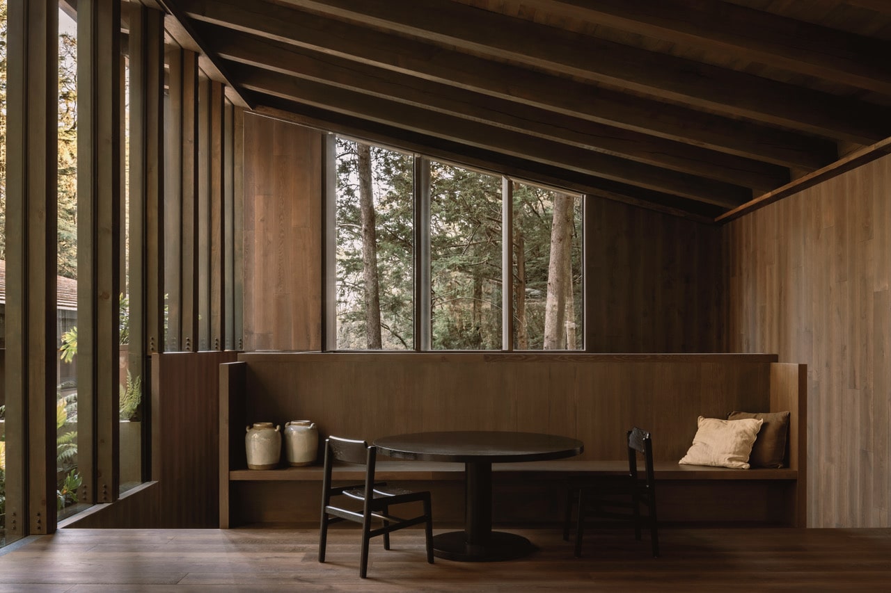 El proyecto contempla tres estrategias: Crear un fondo neutro de madera de roble entintada y avejentada. La construcción de una estructura de madera enchapada de roble en el plafón que también está basada en técnicas japonesas de ensambles. Crear un límite difuso entre el interior y el exterior. Un asiento lineal continuo recorre a todo lo largo de la fachada y se delimita por medio de una jardinera que armoniza espacio y naturaleza.