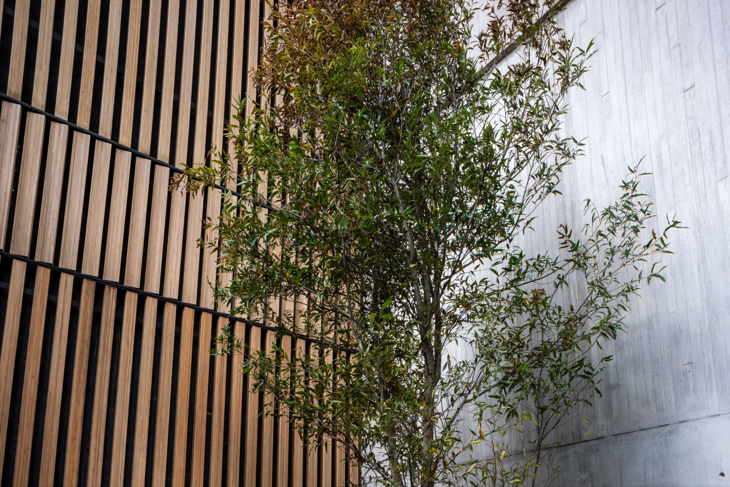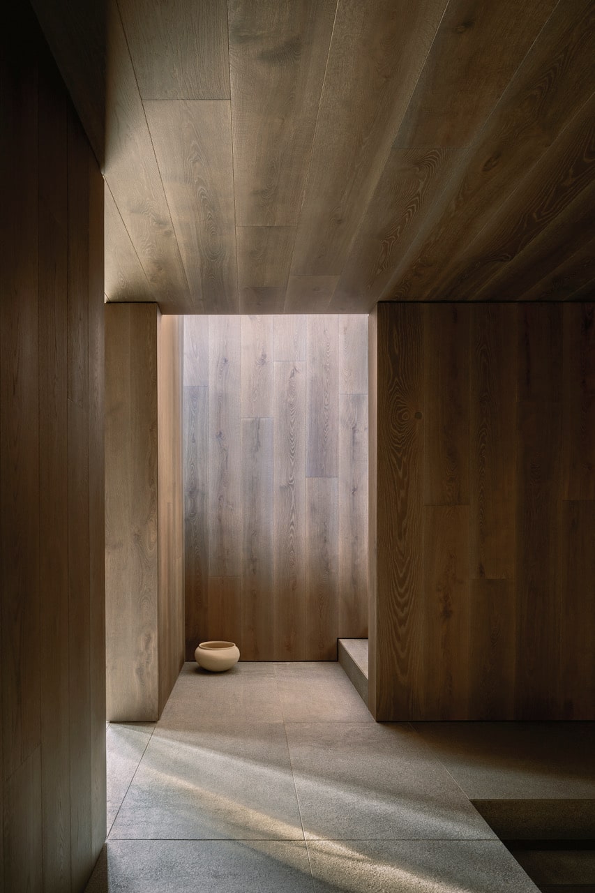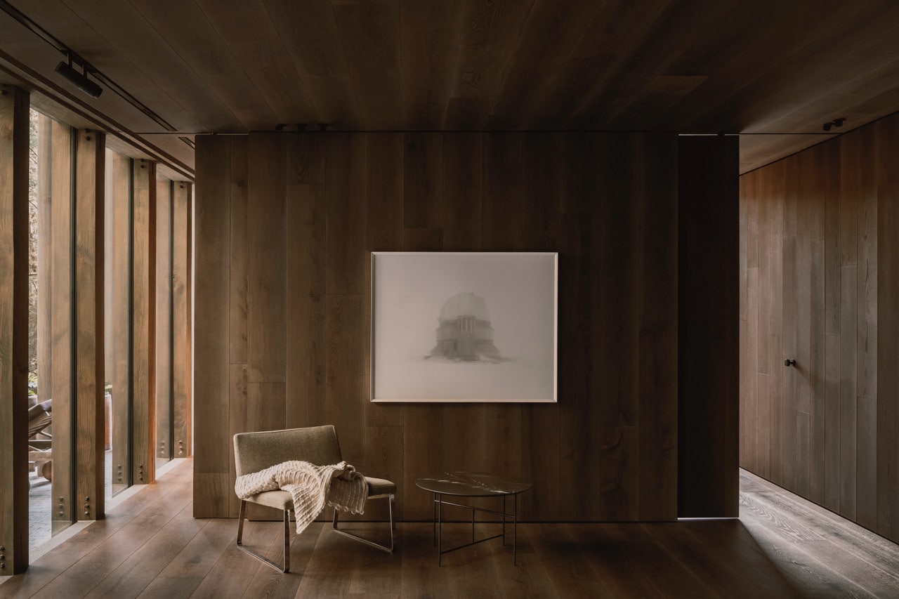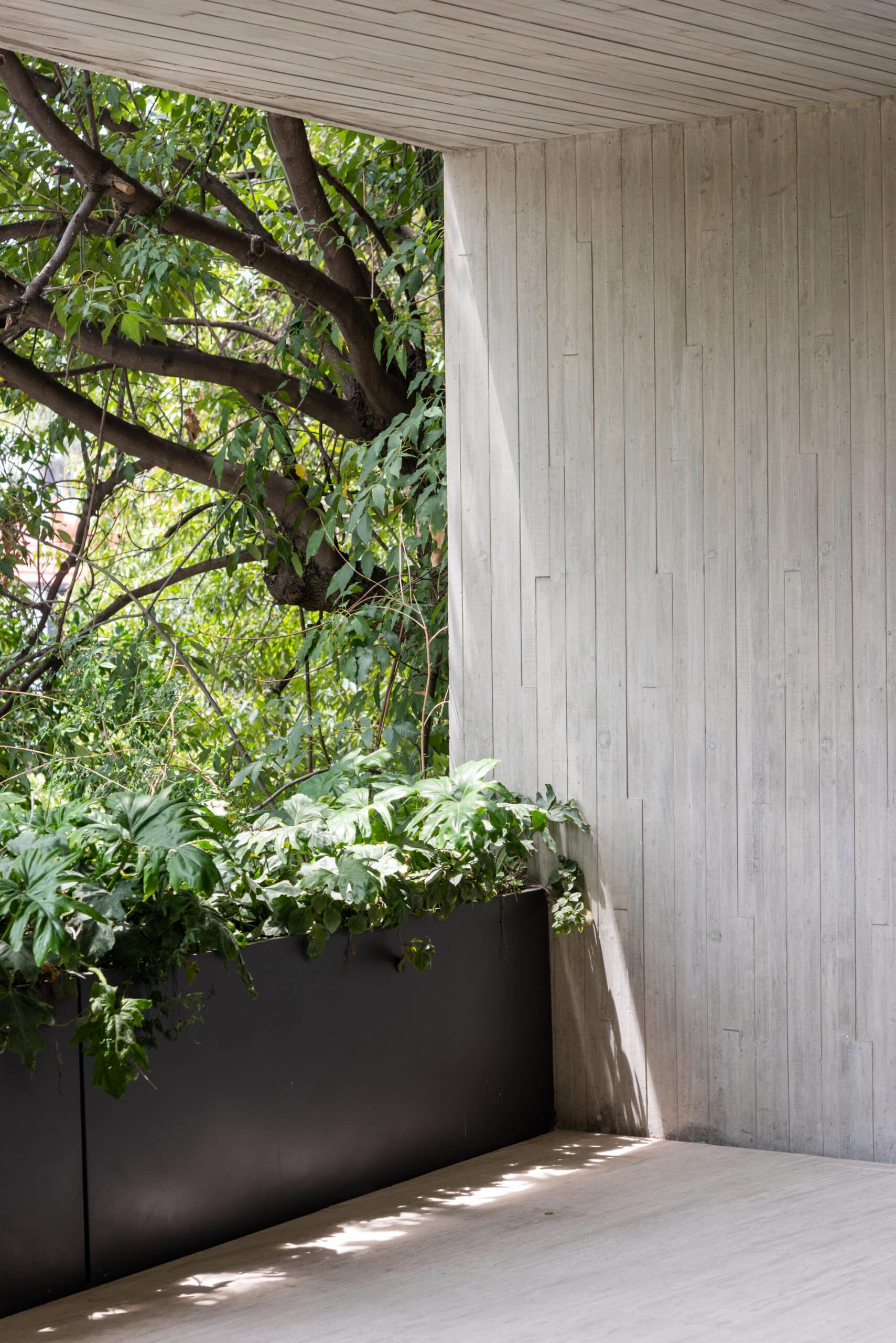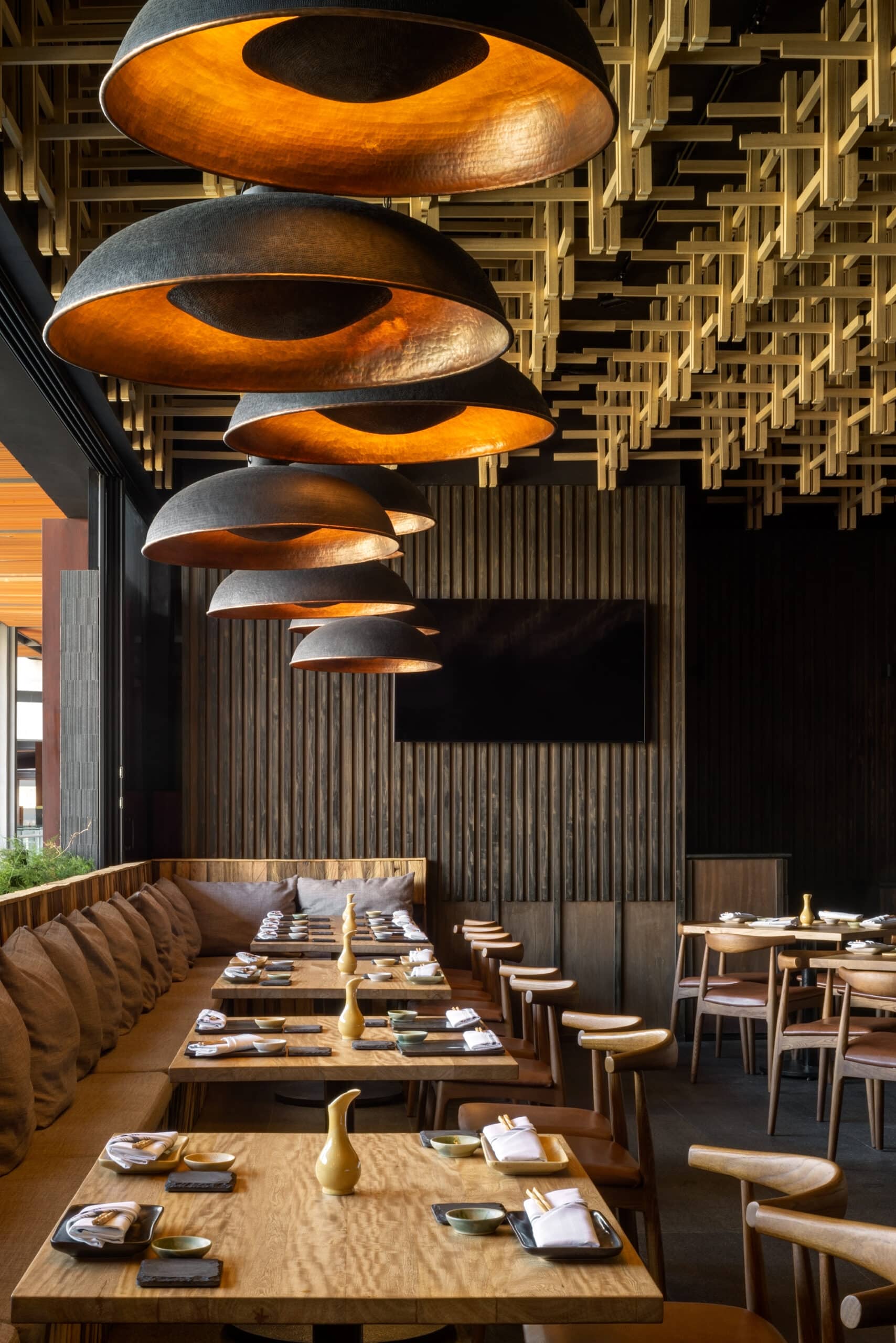 El proyecto contempla tres estrategias: Crear un fondo neutro de madera de roble entintada y avejentada. La construcción de una estructura de madera enchapada de roble en el plafón que también está basada en técnicas japonesas de ensambles. Crear un límite difuso entre el interior y el exterior. Un asiento lineal continuo recorre a todo lo largo de la fachada y se delimita por medio de una jardinera que armoniza espacio y naturaleza.