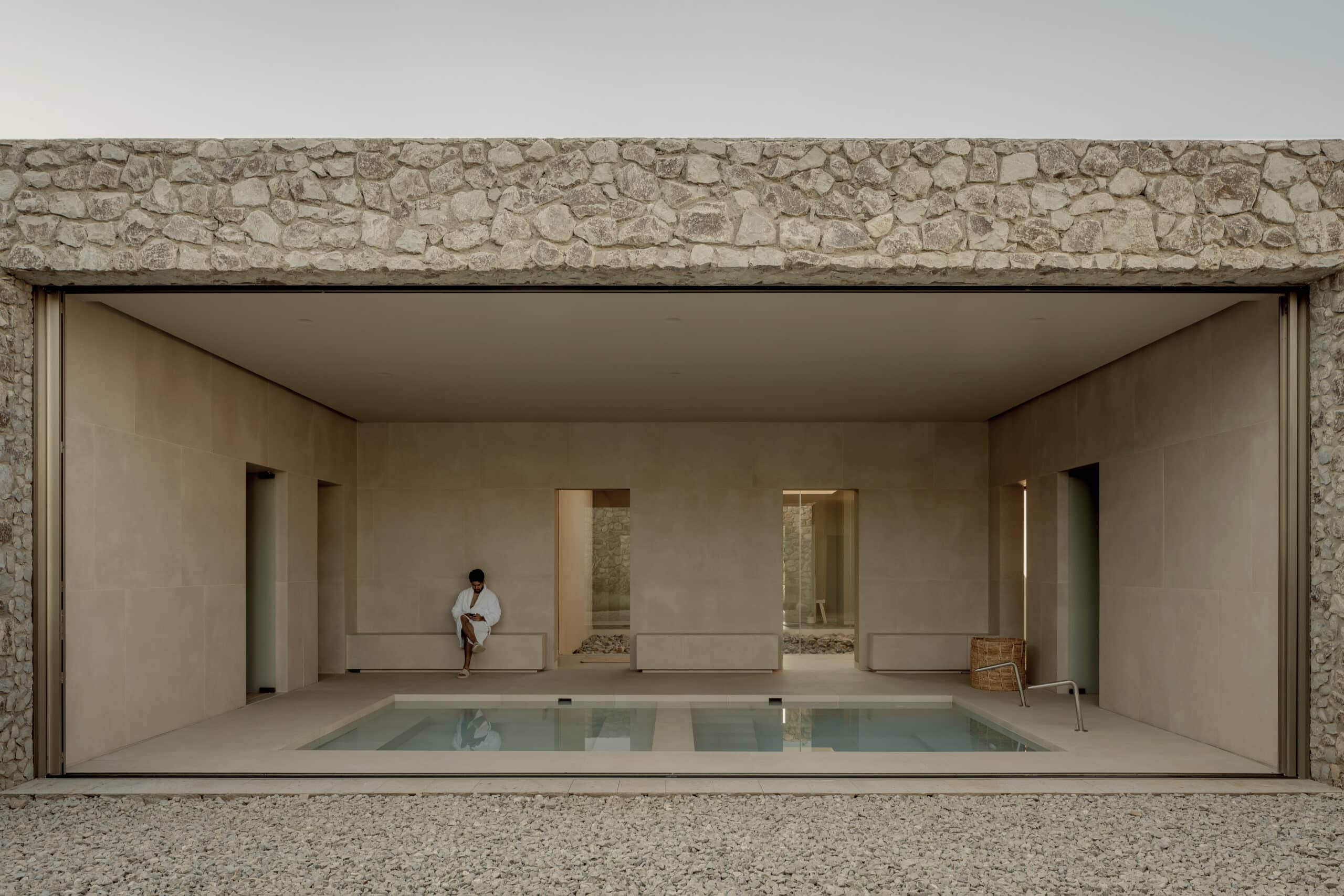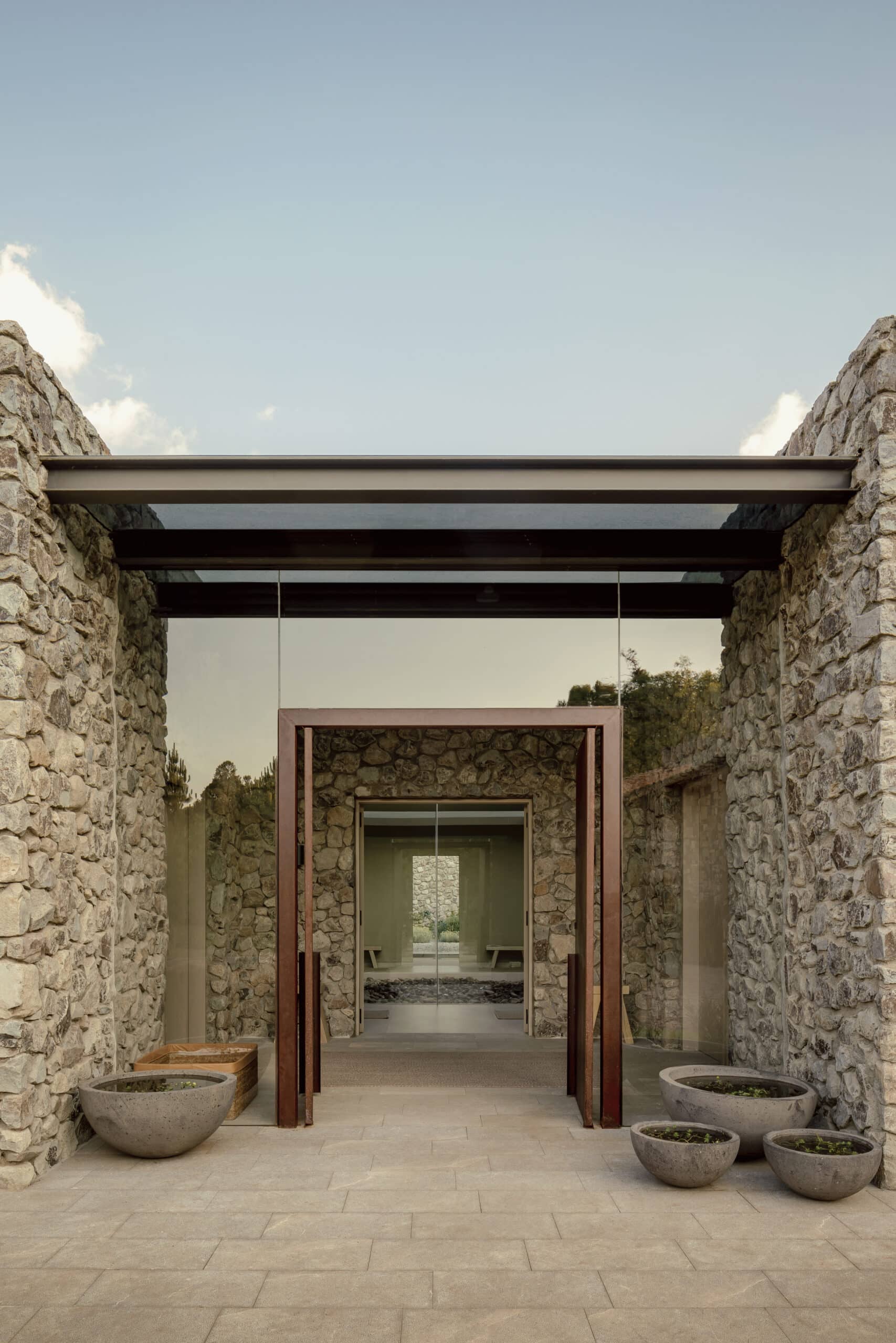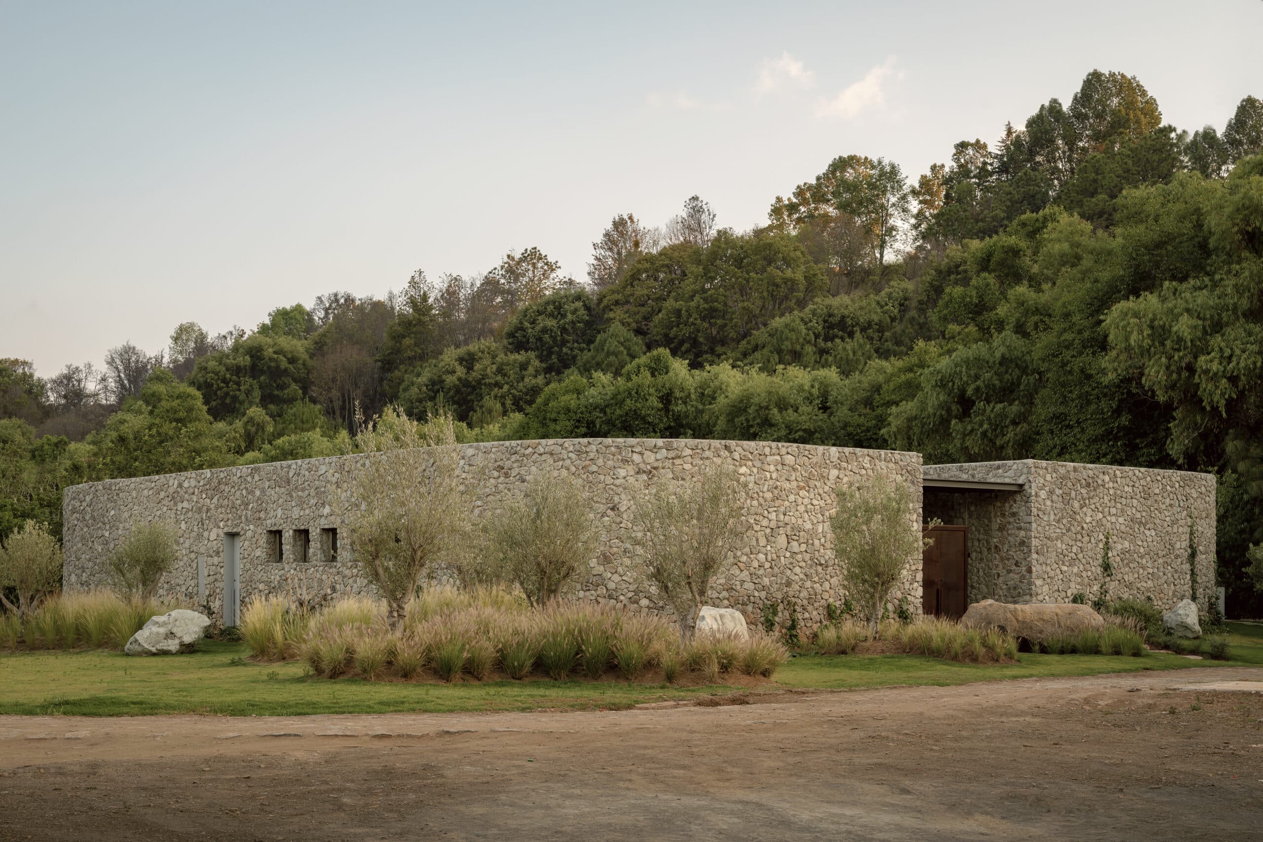 Todo el conjunto se organiza a partir de una planta cruciforme; así, el espacio se divide en cuatro cuadrantes por una cruz de andadores de piedra que define los recorridos, enmarca momentos, y separa un cuadrante del otro. En el tercer cuadrante se ubica la casa de una sola habitación; los espacios públicos están separados de los privados por un único volumen que contiene baños, vestidor, y área de servicio, y que rompe con la planta libre.