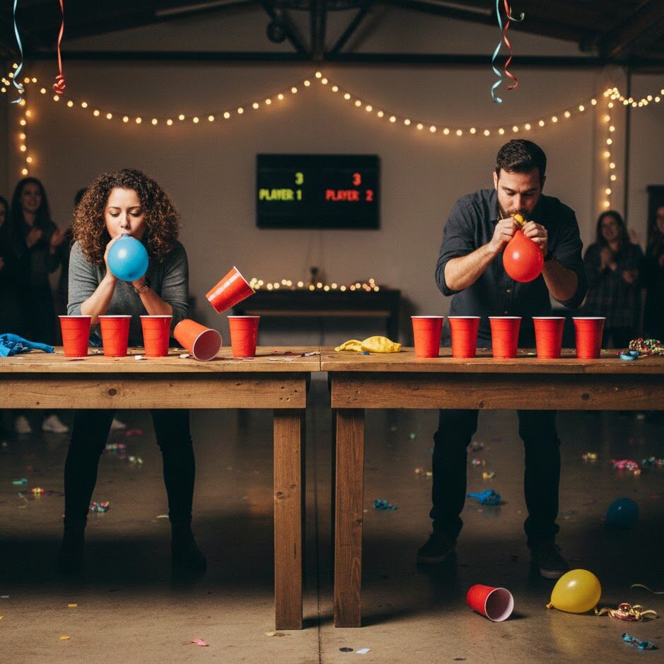 Para este juego necesitas 10 vasos de plástico -o los de tu preferencia- y dos globos. El objetivo es que dos personas tengan cinco vasos alineados y con el aire de un globo deberán tirar sus vasos por el borde de la mesa. Pueden inflar el globo cuantas veces sea necesario. Gana quien tire sus cinco vasos primero.