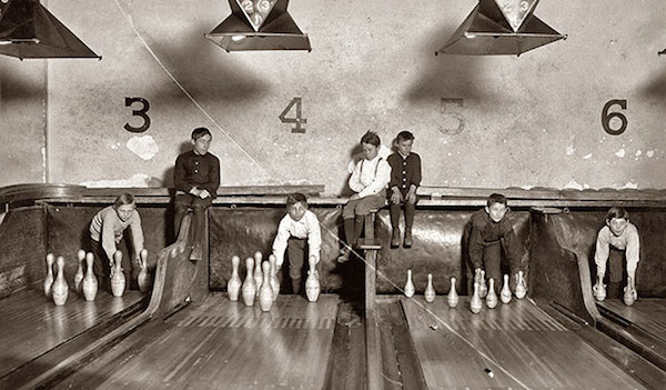 Antes de que las máquinas automáticas resetearan los pinos, había personas (casi siempre adolescentes o jóvenes) sentados detrás de las pistas esperando a que terminara el turno para entrar, recolocar los pinos y devolver la bola. Era un trabajo de riesgo: las bolas volaban a alta velocidad y los dedos quedaban expuestos.