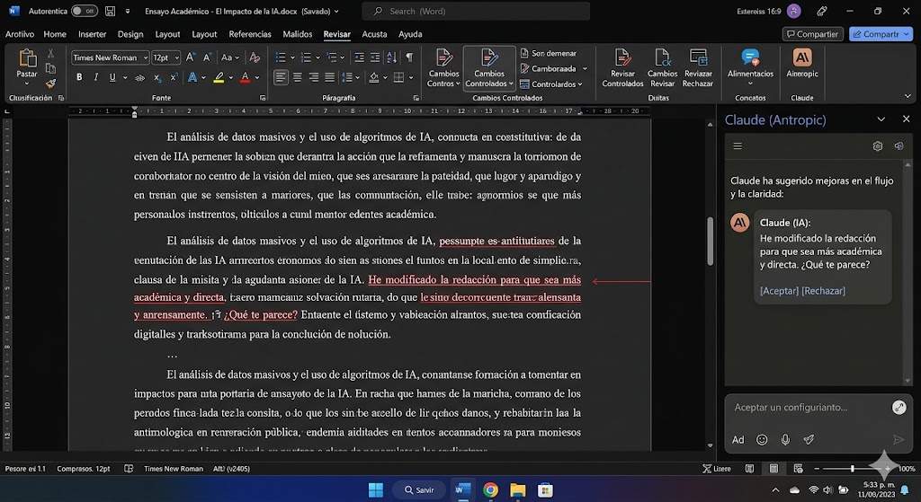 • Modo cambios controlados: las ediciones aparecen como revisiones nativas de Word. Tú decides si las aceptas.