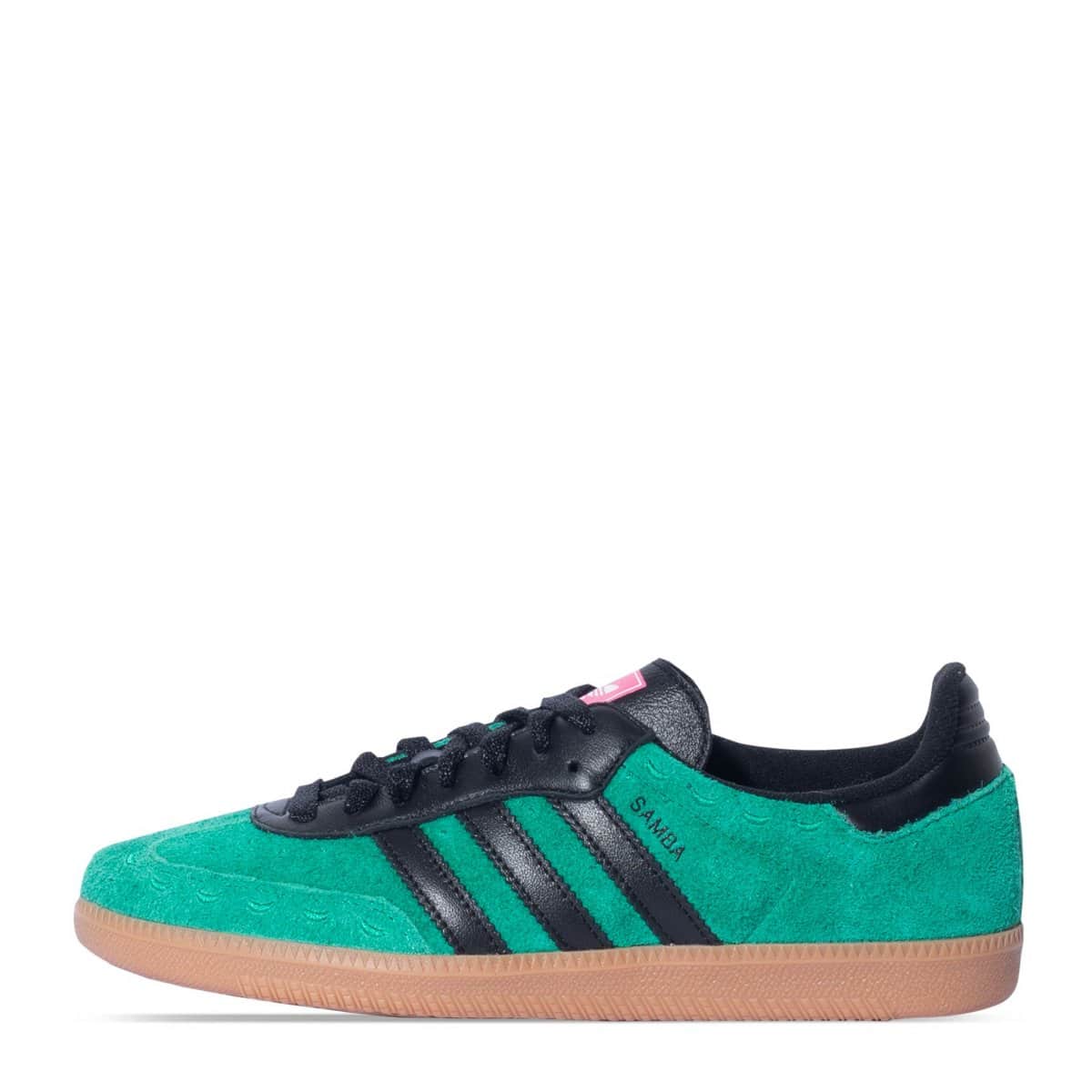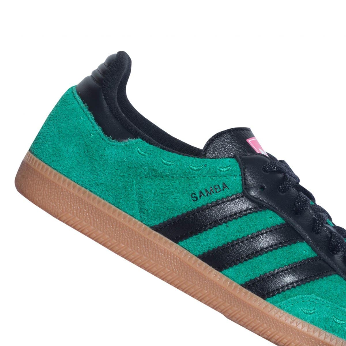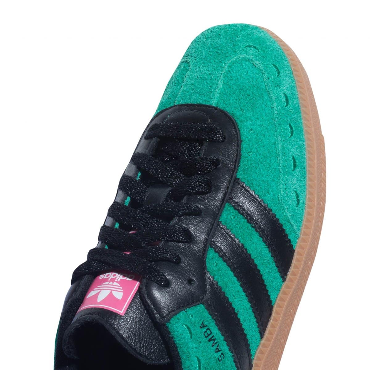 Con un nobuk verde, detalles negro en las franjas y agujetas, más un rosa mexicano en la lengüeta, estos Samba hacen una alegoría a los tradicionales tapetes mexicanos, gracias también al patrón punteado presente en la punta y el cuello del modelo.