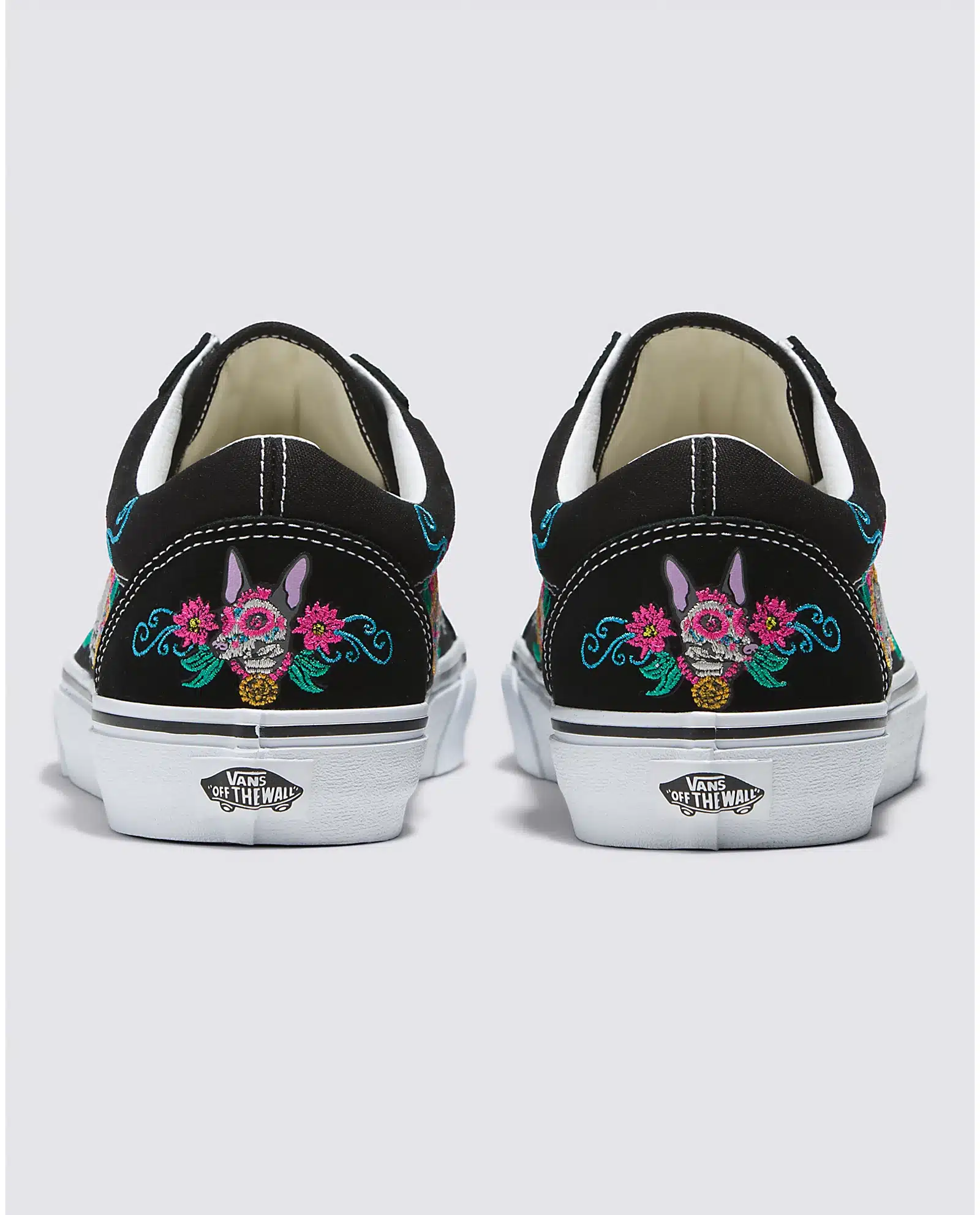 También con un bordado colorido, este par muestra un Xolo sentado y rodeado de flores de cempasúchil, calaveritas de azúcar y garigoles de colores en tonos neón perfectos para la temporada. Un mix asombroso de pasado, presente y futuro.