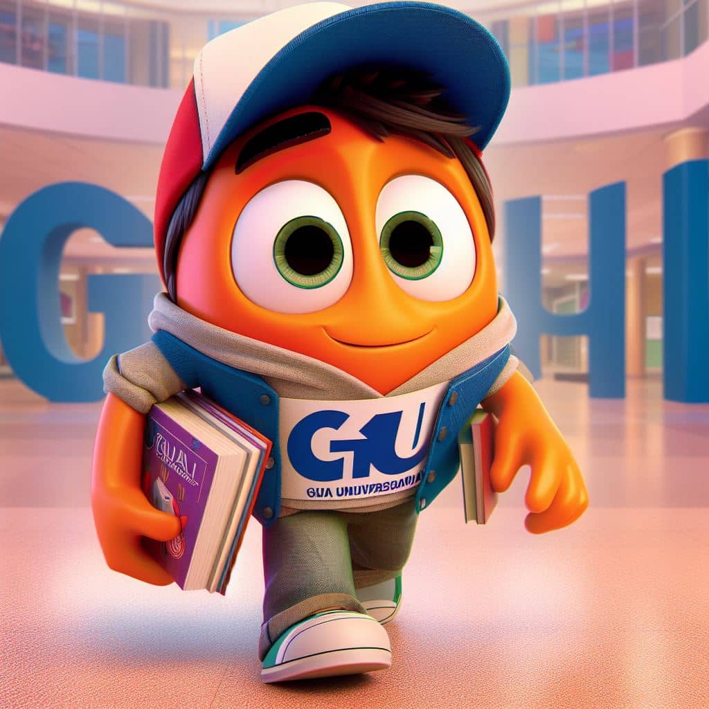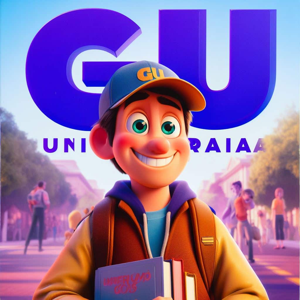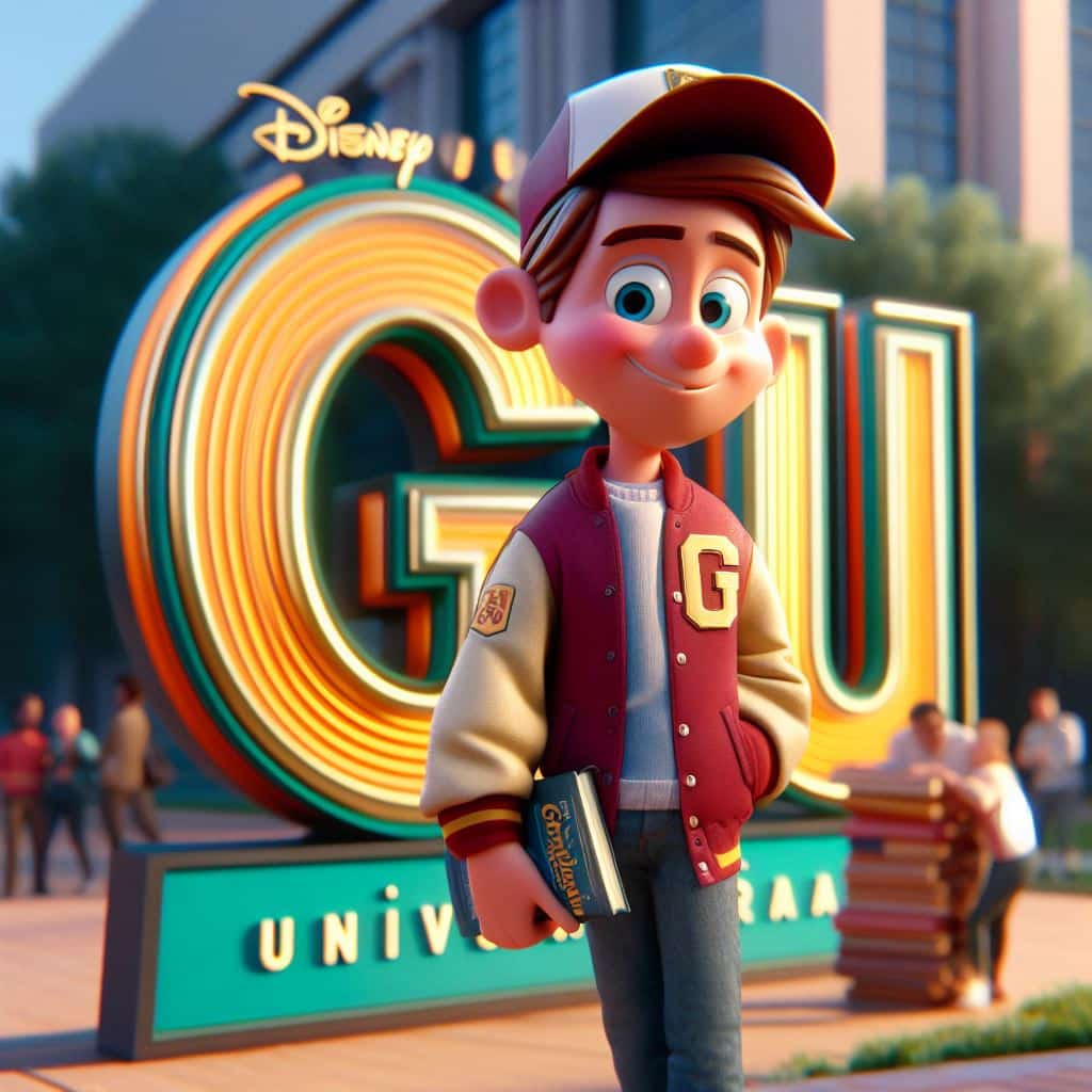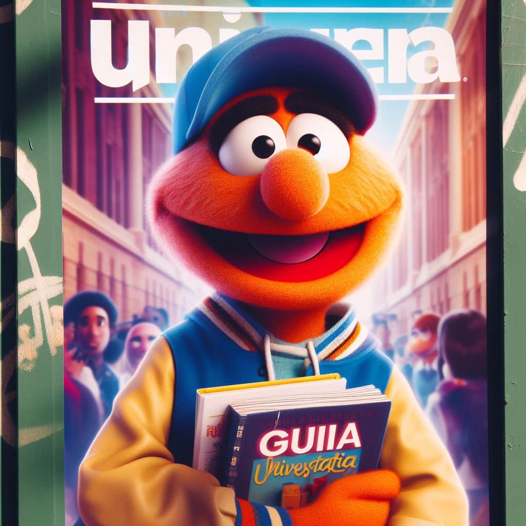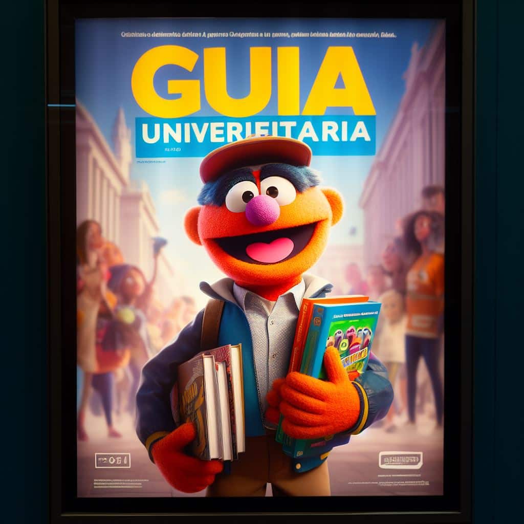 Póster en el estilo de Pixar, con personajes de animación 3D, con colores vibrantes y detalles. El título es ‘Guía universitaria’ y muestra un personaje estilo mupet de edad universitaria como personaje principal, usa una gorra y chamarra estilo universitario. El personaje lleva libros en los brazos. En el fondo se observa un ambiente universitario.