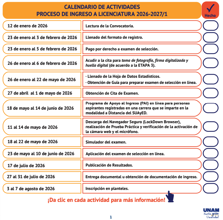 - Consultar los resultados del examen de admisión del Concurso de Selección Febrero 2026 en la página web www.escolar.unam.mx el 17 de julio de 2026.