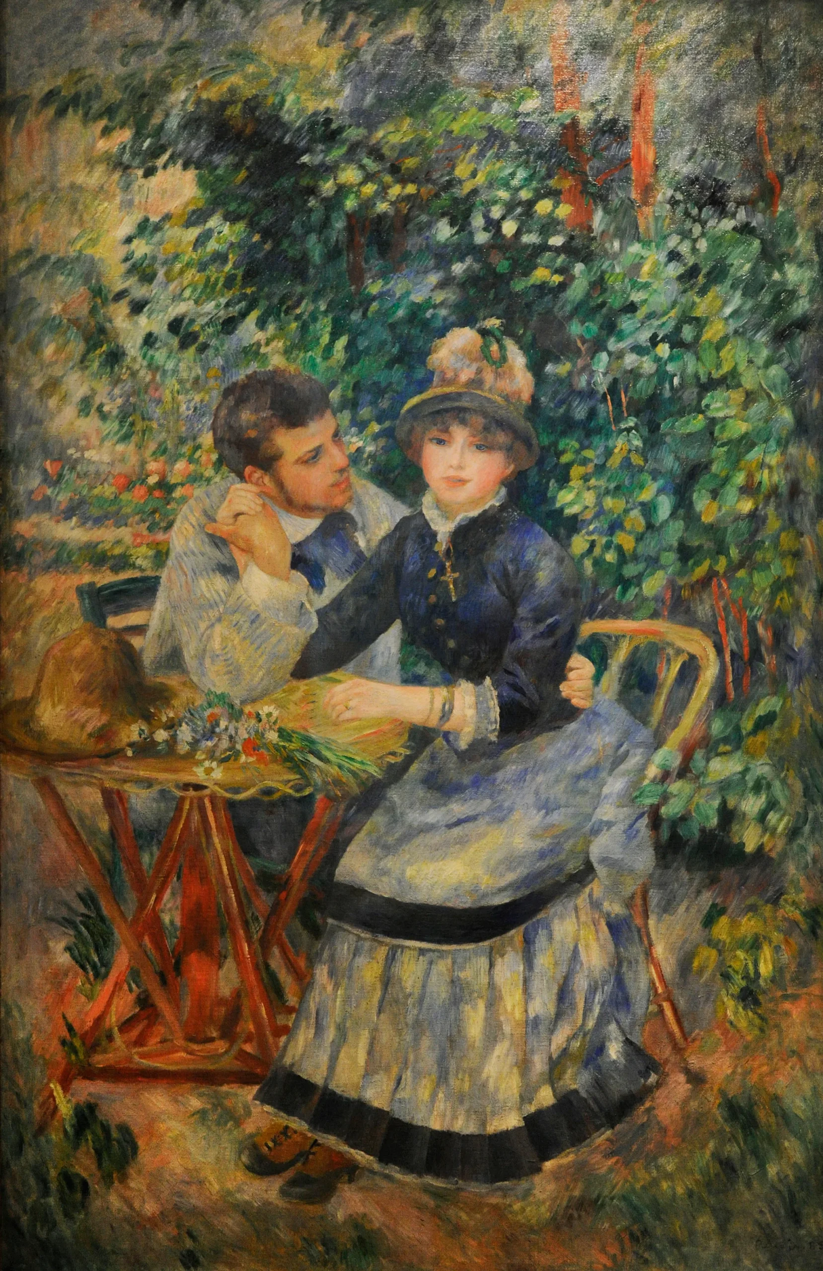 Renoir captura un instante de alegría y complicidad burguesa. La luz moteada, los colores vivos y la naturalidad de la escena la alejan de lo ceremonial, mostrando el amor en el arte como un momento de pura y simple felicidad compartida.