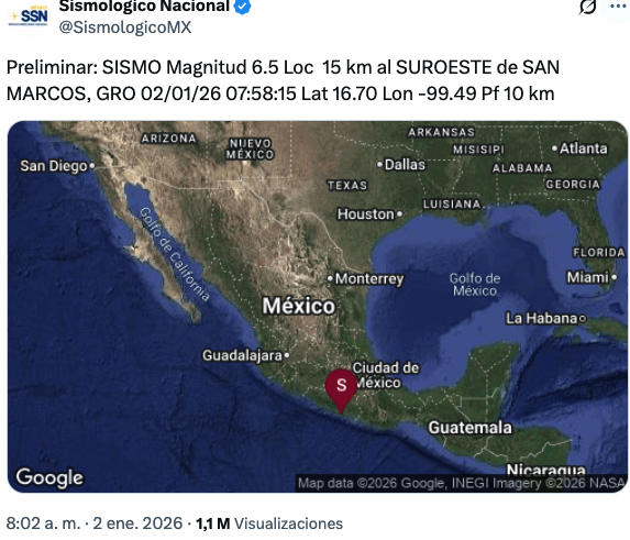 Actualización: 🚨 ¡Última Hora! 🚨 Despertamos bravos, pues la mañana de este 2 de enero de 2026. Un sismo preliminar de magnitud 6.5 se registró a las 7:58 en San Marcos, Guerrero. Las alertas de celulares avisaron a la población.