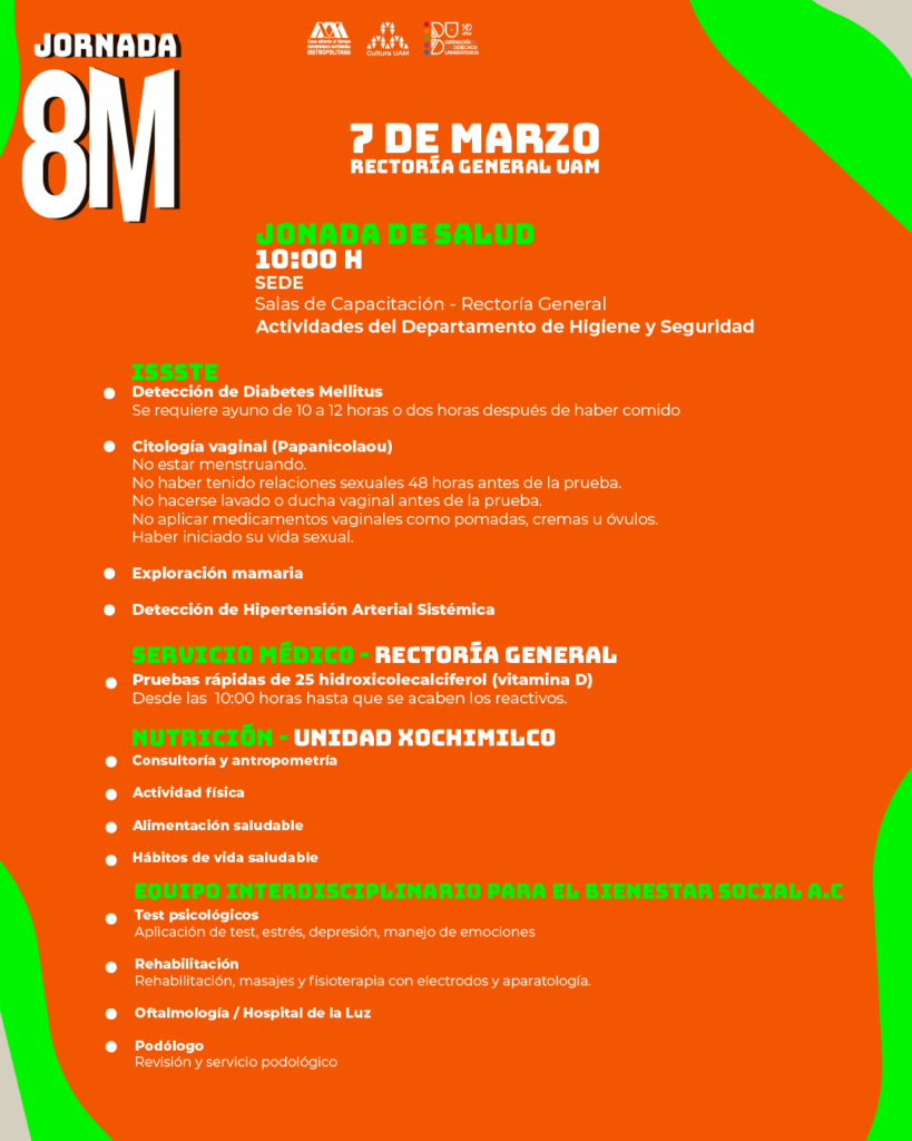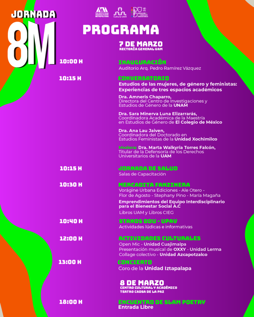 La Universidad Autónoma Metropolitana (UAM) ha preparado una Jornada 8M que se llevará a cabo el 7 de marzo en la Rectoría General. Este evento incluirá: