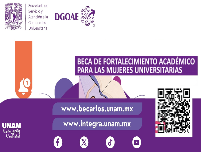 - Requisitos clave: Estar inscrita en planteles como Facultad de Ingeniería, Ciencias, Química, FES Cuautitlán, Aragón, Zaragoza, Acatlán, ENES, entre otros.