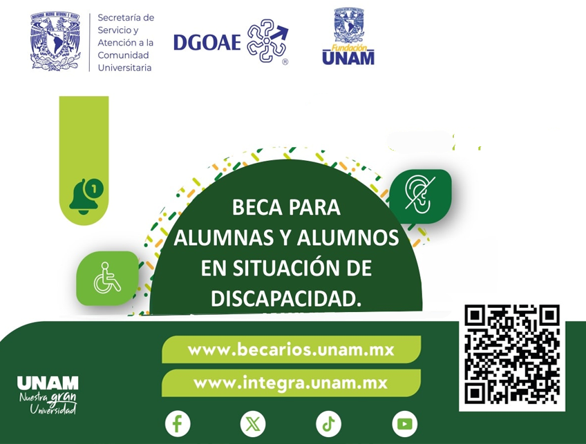 - ¿En qué consiste? La UNAM cuenta con programas de apoyo específicos para estudiantes en situación de discapacidad. Los detalles exactos de monto y requisitos para el ciclo 2025-2026 suelen publicarse en las convocatorias oficiales. Se recomienda estar atento a los canales de la DGOAE.