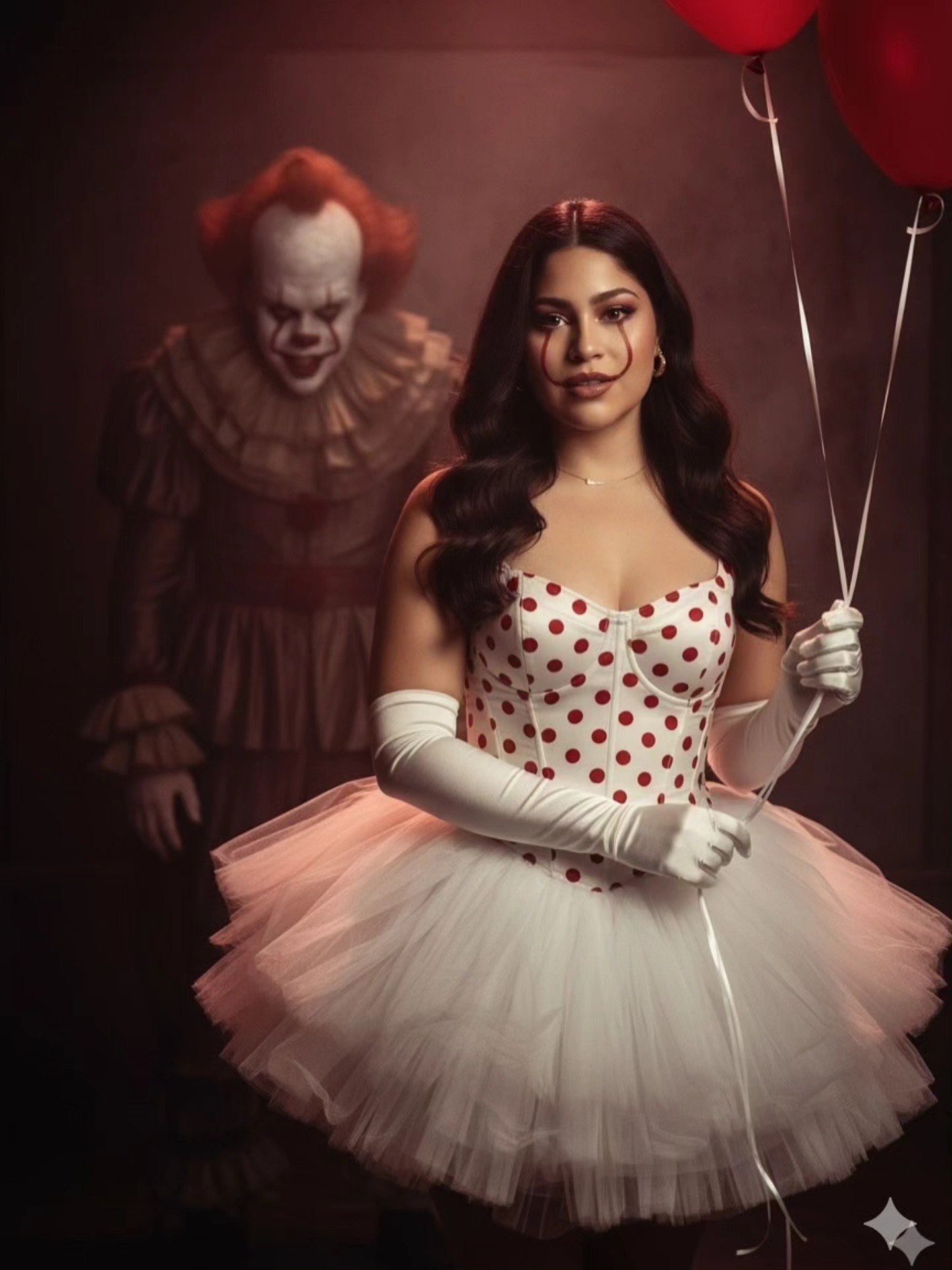 4. “Realistic portrait of a woman dressed in a stylized It: The Clown inspired costume. Keep the woman’s real face and natural hair exactly as in the reference photo – preserve her authentic facial features, skin tone, and hair color/ texture. She wears a white corset with red polka dots and a white tulle skirt, accessorized with long white gloves and holding two red balloons. Makeup inspired by Pennywise, with subtle red lines and artistic glam finish, maintaining beauty and elegance. In the background, slightly blurred and in shadow, appears Pennywise the clown, in a dark corner – cinematic lighting makes him barely visible, enhancing mystery. Scene lighting: warm spotlight on the woman, soft shadows behind her, misty background, red and sepia tones for a theatrical effect. Style: cinematic horror photography, ultra-detailed, 8K, dramatic yet elegant, inspired by Vanity Fair Halloween editorial.”