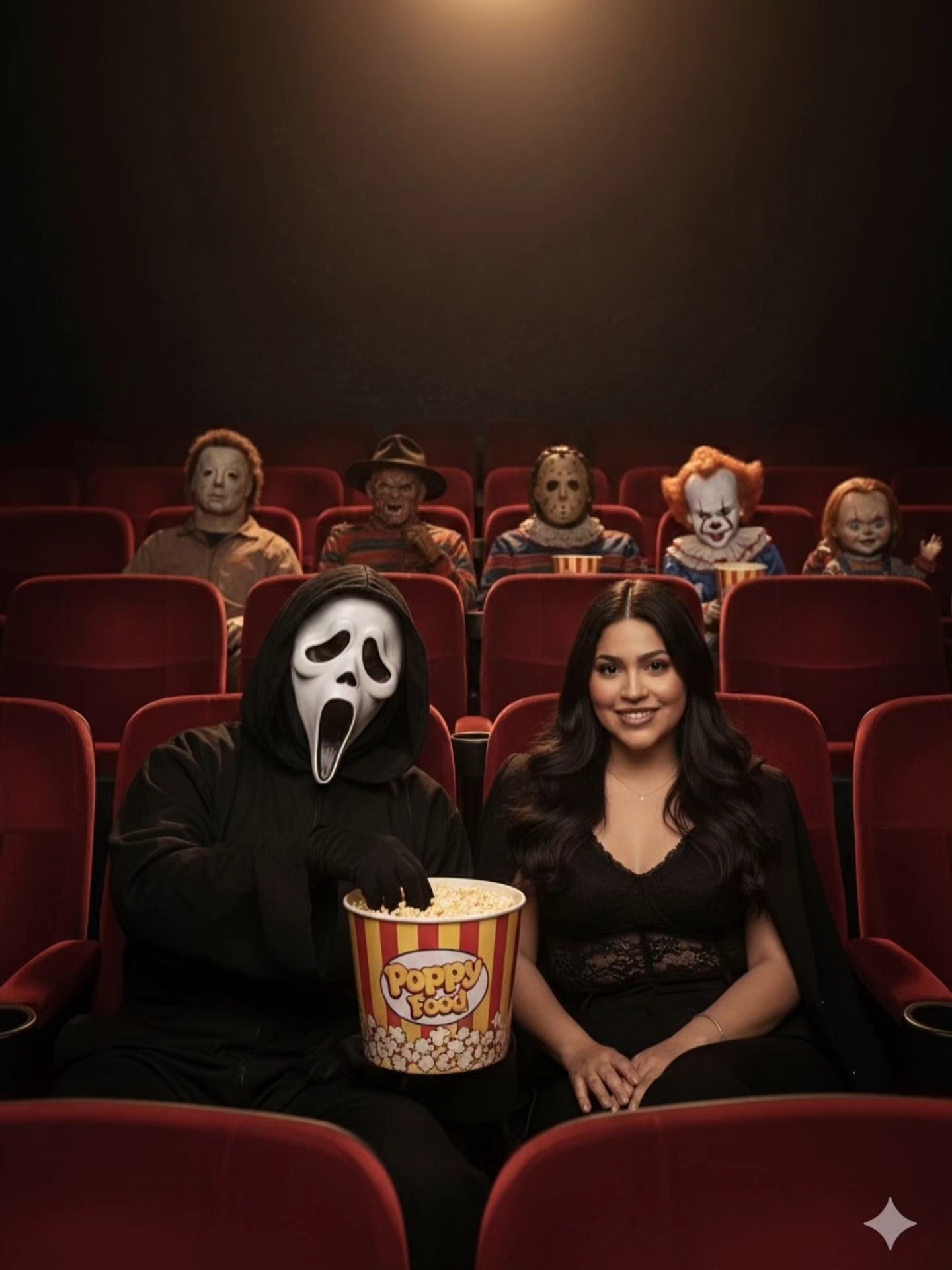 1.- “Cena hiper-realista ambientada em um cinema escuro com fileiras de poltronas vermelhas, com iluminação suave vinda da tela. No primeiro plano, uma mulher mantendo seu rosto e cabelo reais, cabelos longos soltos, maquiagem impecável e expressão confiante, veste blusa preta rendada, jaqueta jeans caída nos ombros e calça escura. Ela segura um grande balde de pipoca com a logo ‘Poppy Food’ e está sentada ao lado de um personagem mascarado de Ghostface (Pânico), que também pega pipoca. Ao fundo, em outras cadeiras, estão sentados ícones clássicos del terror: Michael Myers, Freddy Krueger, Jason, Chucky e Pennywise, todos com suas máscaras e trajes originais, assistindo ao filme. O clima é divertido, cinematográfico e levemente sombrio, com uma paleta de cores quente (vermelho, preto, dourado suave) e contraste equilibrado. A composição deve transmitir atmosfera de Halloween, com realismo fotográfico e textura cinematográfica 8K. Foco no rosto real e cor de cabelo original da mulher, preservando suas expressões naturais.”