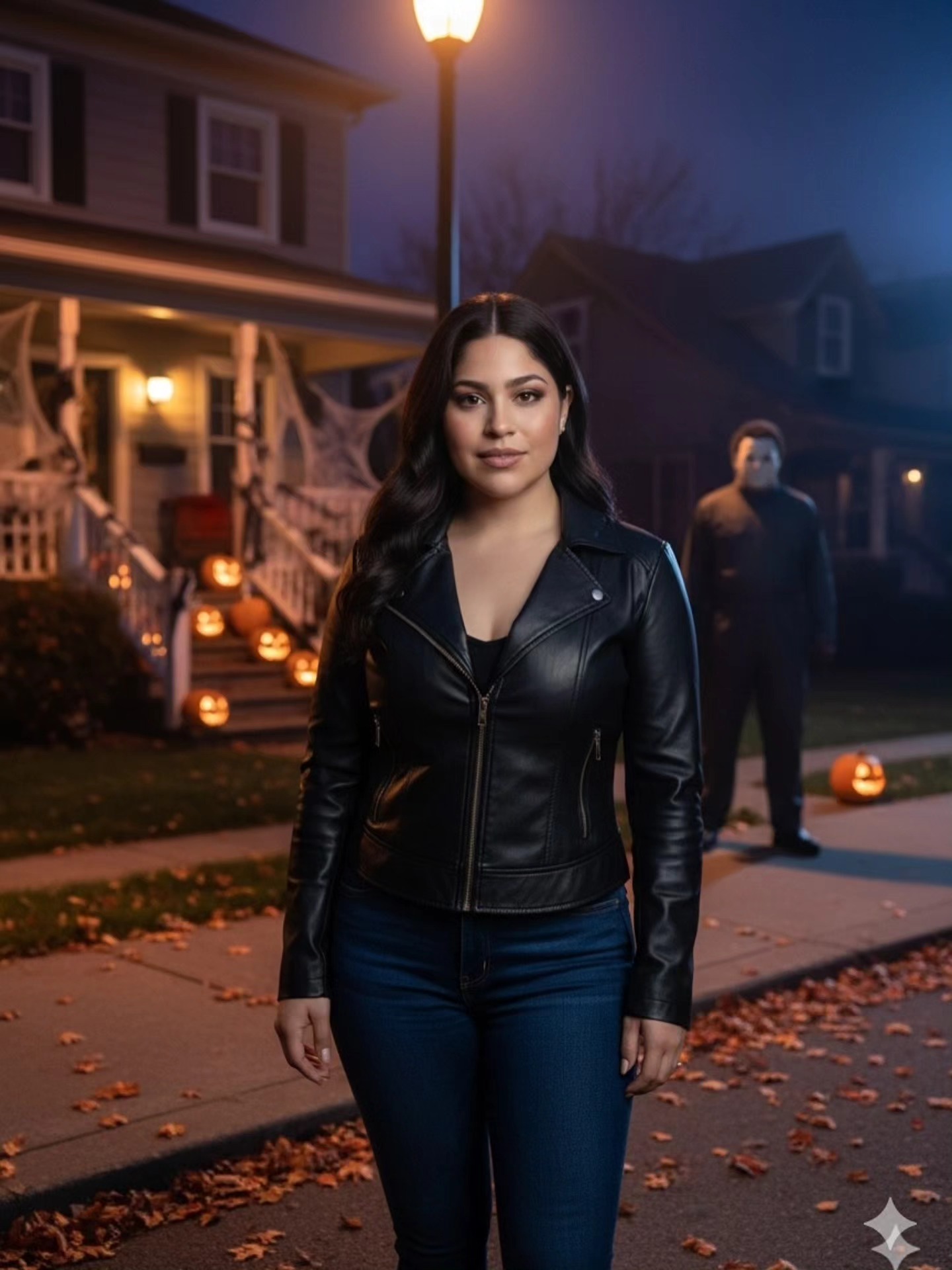 2. “A cinematic Halloween night portrait of a beautiful woman standing on a quiet suburban street with autumn leaves on the ground, in front of a house decorated with glowing jack-o’-lanterns and spider webs. A masked man dressed as Michael Myers stands in the background near the house, slightly blurred for depth. The woman has her real face and natural hair exactly as in the reference photo – keep all authentic facial features and her true hair color and texture, without bangs. She wears a fitted black leather jacket, dark jeans, and subtle smoky makeup, giving her a confident and mysterious look. The scene is illuminated by warm streetlight glow mixed with cool night tones, creating a cinematic Halloween atmosphere. Ultra-realistic, high-resolution, moody lighting, depth of field focused on the woman.”