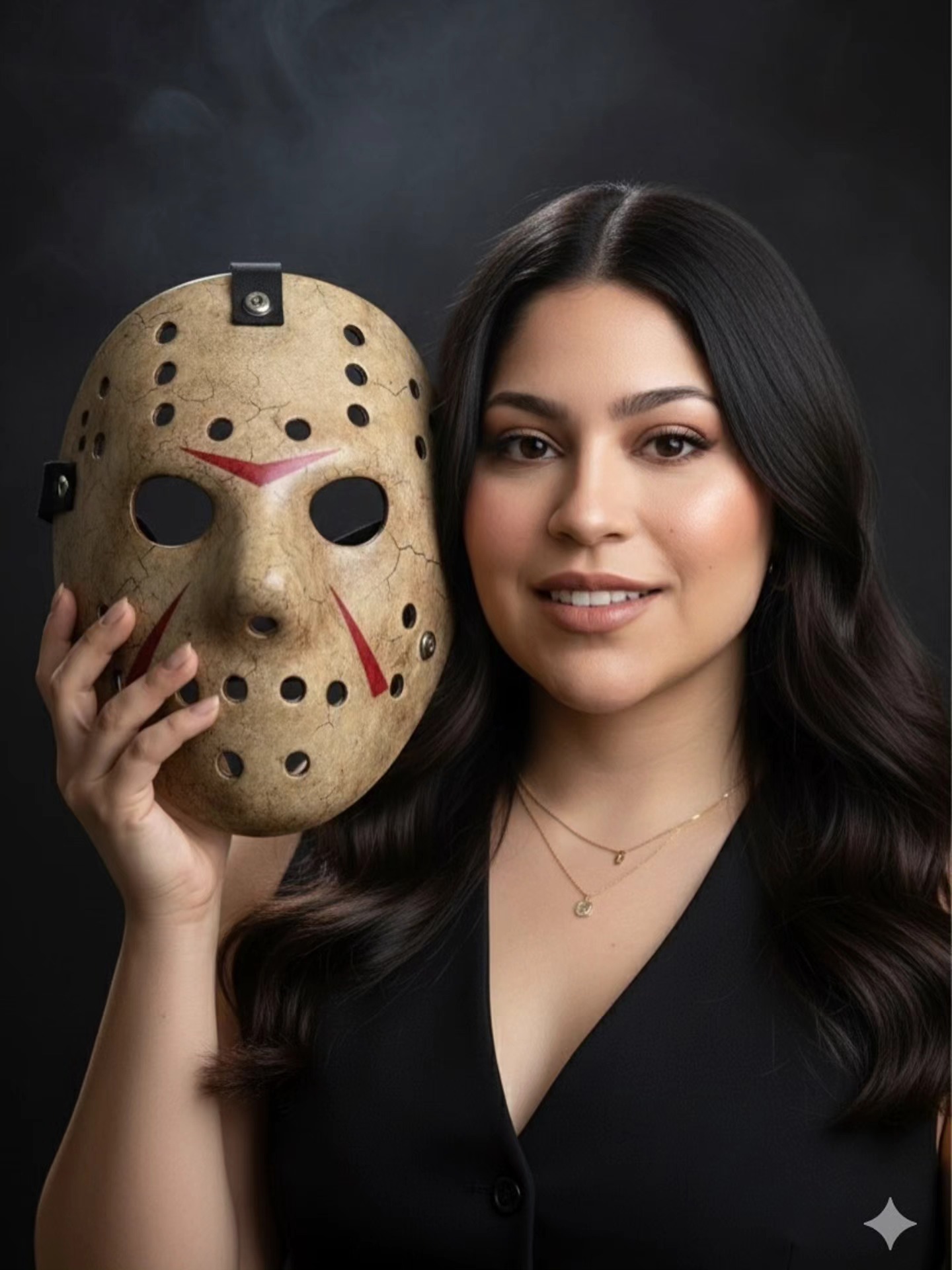 5. “Portrait of a woman holding a vintage horror movie mask beside her face. The woman keeps her real facial features and natural hair exactly as in the reference photo – maintain her authentic face shape, hair color, texture, and makeup style. The mask is an aged, beige hockey-style mask with red markings, slightly weathered and cinematic. The background is dark and moody, softly lit with a subtle haze of smoke drifting upward for atmosphere. The lighting is cinematic and dramatic, focused on the woman’s face and mask, creating contrast and mystery. Her expression is confident yet calm, looking directly at the camera. Style: ultra-realistic portrait photography, editorial lighting, shallow depth of field, fine skin texture, soft smoky tones, 4K resolution.”
