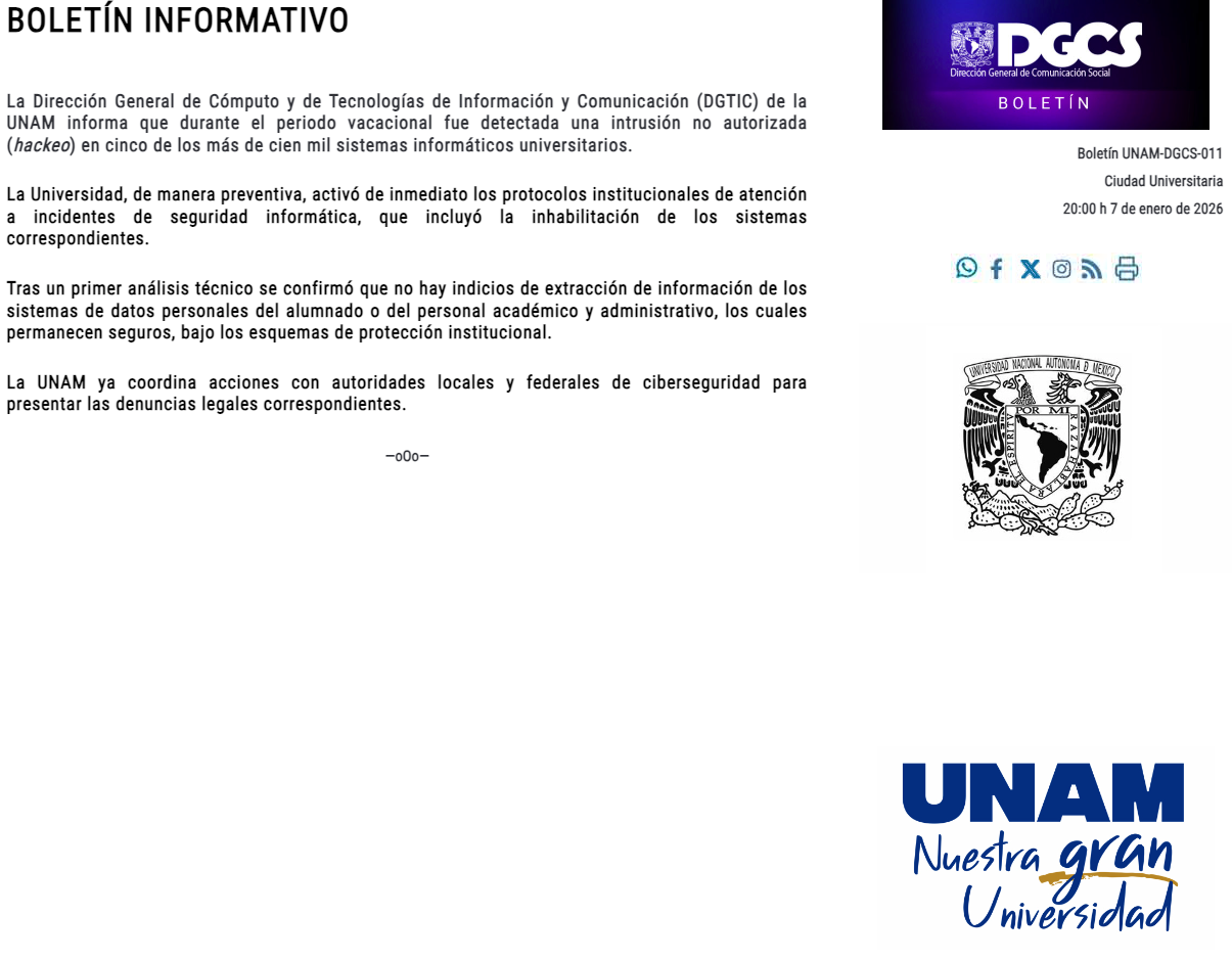 El periodista Iván Villaseñor reportó que información robada de la base de datos de la UNAM está a la venta. Se habrían comprometido datos de aproximadamente 380 mil personas, incluyendo correos, contraseñas y fotografías. Lo más grave: al parecer, se obtuvieron “llaves maestras” que darían acceso a un amplio espectro de información.